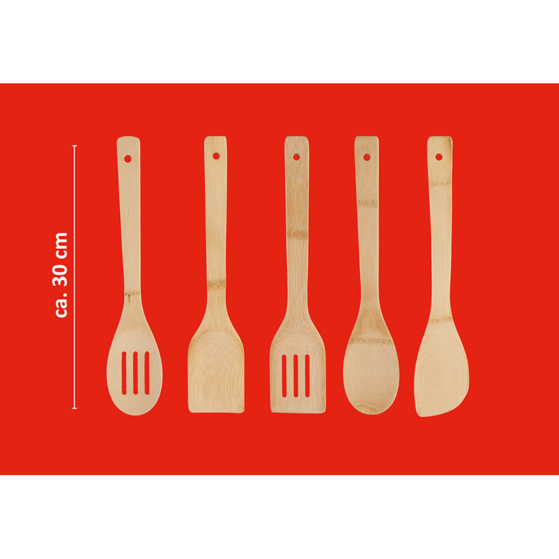 Zestaw 5 przyborów kuchennych z pojemnikiem, wykonanych z drewna. W zestawie znajdują się: szczypce, łopatka, łyżka do mieszania, łyżka do odcedzania, łyżka do makaronu oraz pojemnik do przechowywania.