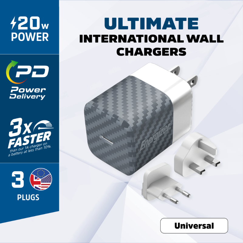 Szybka i niezawodna ładowarka sieciowa typu GaN Energizer Ultimate wyposażona w port USB-C o maksymalnej mocy wyjściowej 20W.