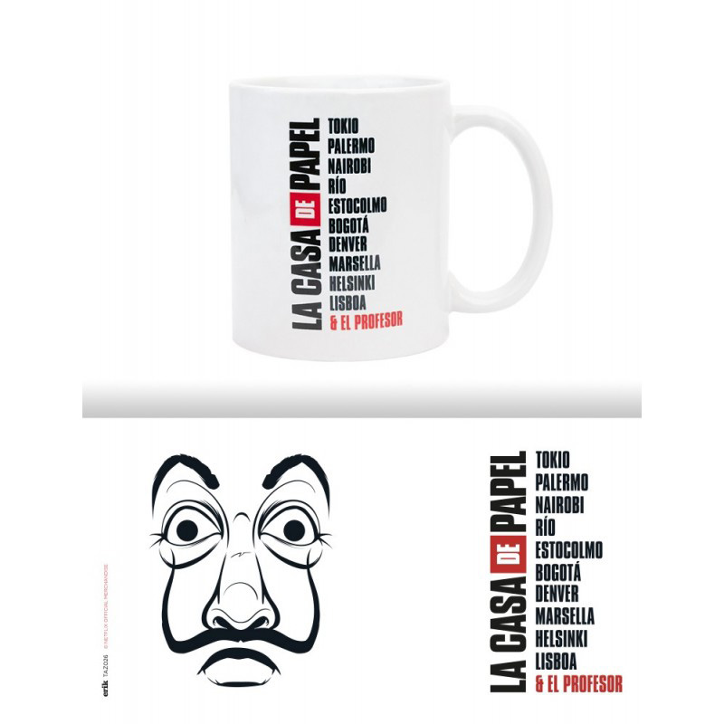 Enter a world full of intrigue and suspense with a mug inspired by the iconic series 'House of Paper'. This stylish 330ml ceramic mug is the perfect accessory for any fan of this Spanish production, showcasing Salvador Dali's distinctive mask, which has become a well-known symbol of rebellion in the series. The mug is made of high quality ceramic, ensuring its durability and elegant appearance. Product features: - Capacity: 330 ml - Made from high quality ceramic - Clear and long-lasting colours - Dishwasher safe: Yes - Can be used in the microwave: Yes - Packaged in a gift box - Official manufacturer's licence