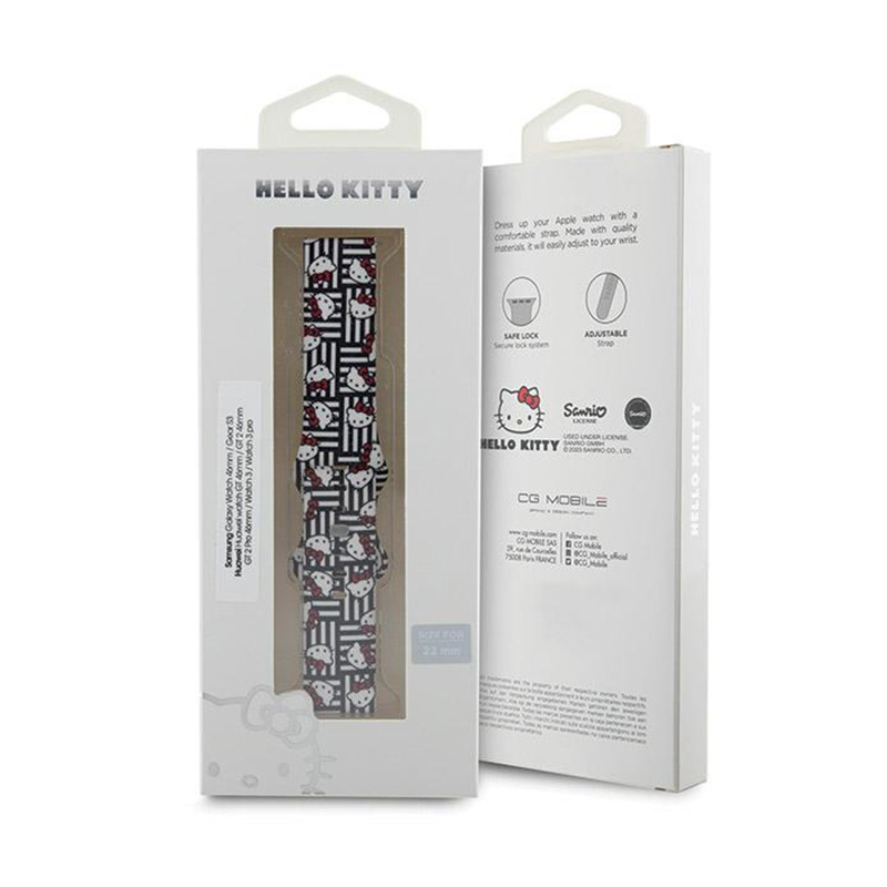 An adorable strap dedicated to smartwatches with a standard 22 mm wide attachment, signed by the Hello Kitty brand. The strap is extremely comfortable and has an adjustable circumference, thanks to the fastening with a loop fastener, allowing it to fit any wrist. Made from the highest quality, soft and durable silicone, the strap is resistant to damage and discolouration, yet gentle on the skin during everyday use. The distinctive colours of the Hello Kitty Silicone Heads & Stripes strap give it a unique touch, while the graphic depicting the image of the famous Hello Kitty cat against a background of numerous black and white stripes makes your smartwatch a unique decoration, arousing admiration among lovers of unusual accessories. Product features: - Stylish design with the image of the famous cat - Material: Silicone, Stainless Steel - Easy assembly - Adjustable clasp - Gentle on the skin - Dedicated model: Smartwatch with 22mm mount - Example compatibility: Samsung Galaxy Watch 46mm / Gear S3 / Huawei Watch GT 46mm / GT 2 46mm / GT 2 Pro 46mm / Watch 3 / Watch 3 Pro - Official Hello Kitty licence