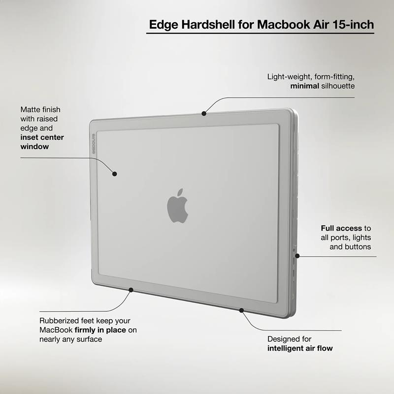 Originální ochranné pouzdro Incase Edge Hardshell pro 15“ MacBook Air s čipovou sadou Apple M2, M3 a M4. Je vyrobeno z mimořádně pevného materiálu Bayer Makrolon® o tloušťce 1,2-1,25 mm a účinně chrání hliníkové pouzdro notebooku před poškrábáním a nárazy a zajišťuje jeho bezpečnost při častém cestování nebo práci mimo domov.