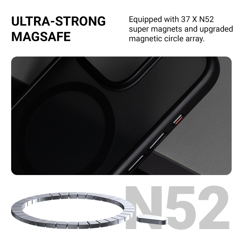 The main element of the Hybrid Frost MAG Cover is a high-quality magnetic ring, which has been integrated with a matte coating resistant to fingerprint marks (anti-fingerprint). Built-in magnets let you use MagSafe accessories like wireless chargers and power banks, as well as car mounts and tripods.