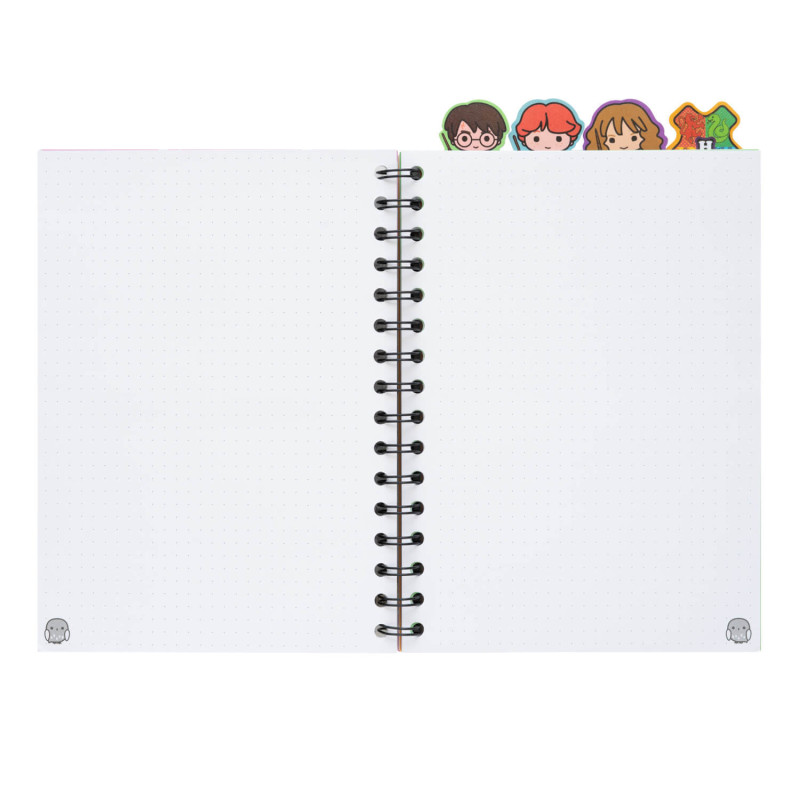 Miękka, matowa okładka z personalizowanym motywem Harry'ego Pottera nadaje całości stylowego wyglądu. Notatnik posiada solidną spiralną oprawę typu wire-o, dzięki czemu łatwo rozkłada się na płasko i jest wygodny w codziennym użytkowaniu. Dodatkowo zawiera cztery specjalne, ozdobne przekładki, które pomogą Ci zorganizować Twoje zapiski.