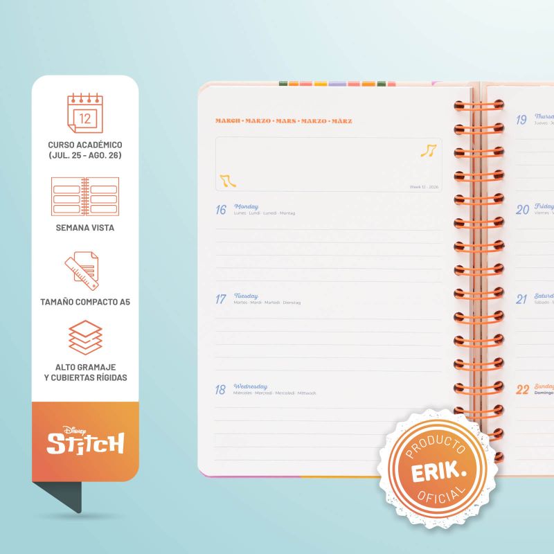 Kalendarz / Planner tygodniowy Disney Stitch na rok 2025/2026 to uroczy kalendarz na 12 miesięcy, począwszy od sierpnia 2025 roku do lipca 2026 roku.