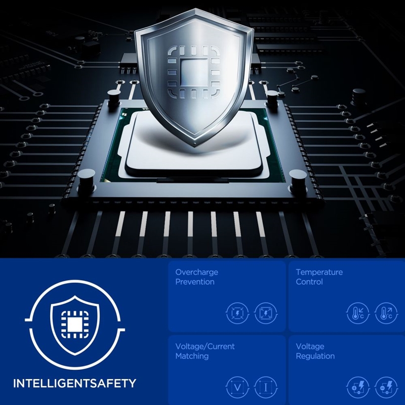 Zastosowana technologia Quantum Boost automatycznie dostosowuje parametry ładowania do podłączonego urządzenia, maksymalizując wydajność i skracając czas ładowania. Bezpieczeństwo zapewnia zestaw zaawansowanych systemów ochrony, takich jak Overcharge Prevention, Voltage Matching i Voltage Regulation, które chronią sprzęt przed przeładowaniem, niestabilnym napięciem oraz nadmiernym prądem.