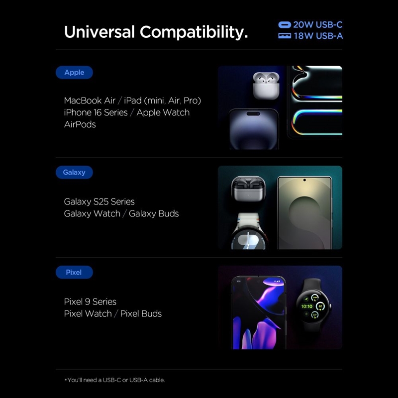 Spigen Essential EE202EU GaN Pro to kompaktowa i wyjątkowo wydajna ładowarka sieciowa stworzona z myślą o szybkim, inteligentnym i bezpiecznym zasilaniu Twoich urządzeń. Wyposażona w port USB-C o mocy 20W oraz USB-A 18W, umożliwia jednoczesne ładowanie dwóch sprzętów, dostarczając optymalną moc smartfonom, tabletom, słuchawkom i innym akcesoriom.